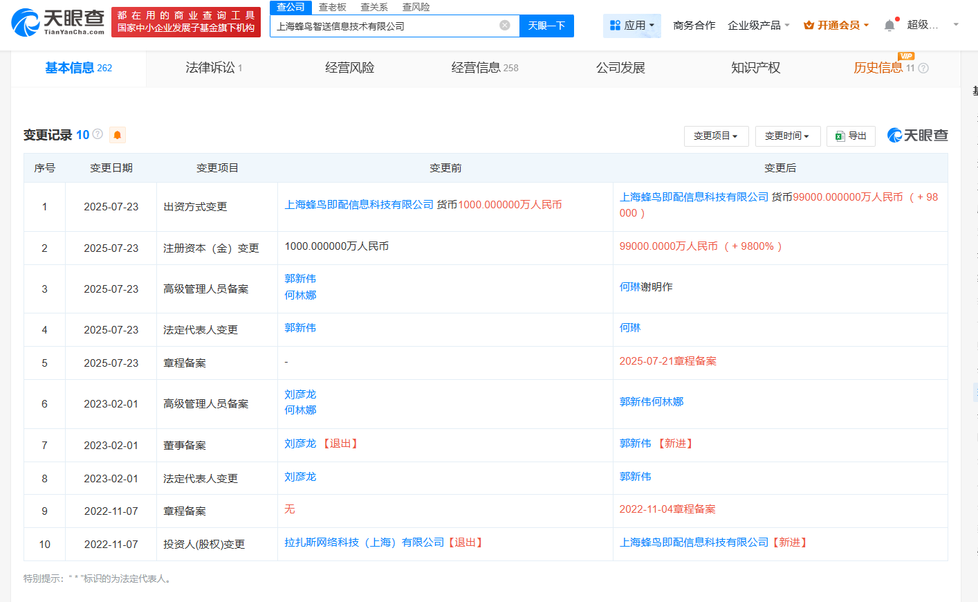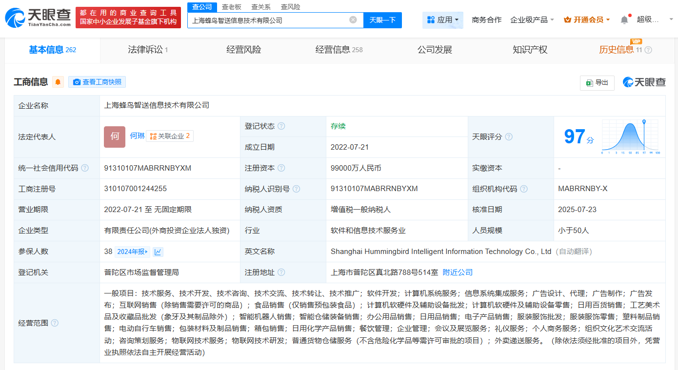 值得注意的是,上海蜂鸟智送信息技术有限公司的背后,有着上海蜂鸟即配信息科技有限公司的全资持股。这一股权结构无疑为公司的稳健发展提供了坚实的后盾。随着注册资本的大幅增加,公司有望进一步扩大业务规模,提升市场竞争力。