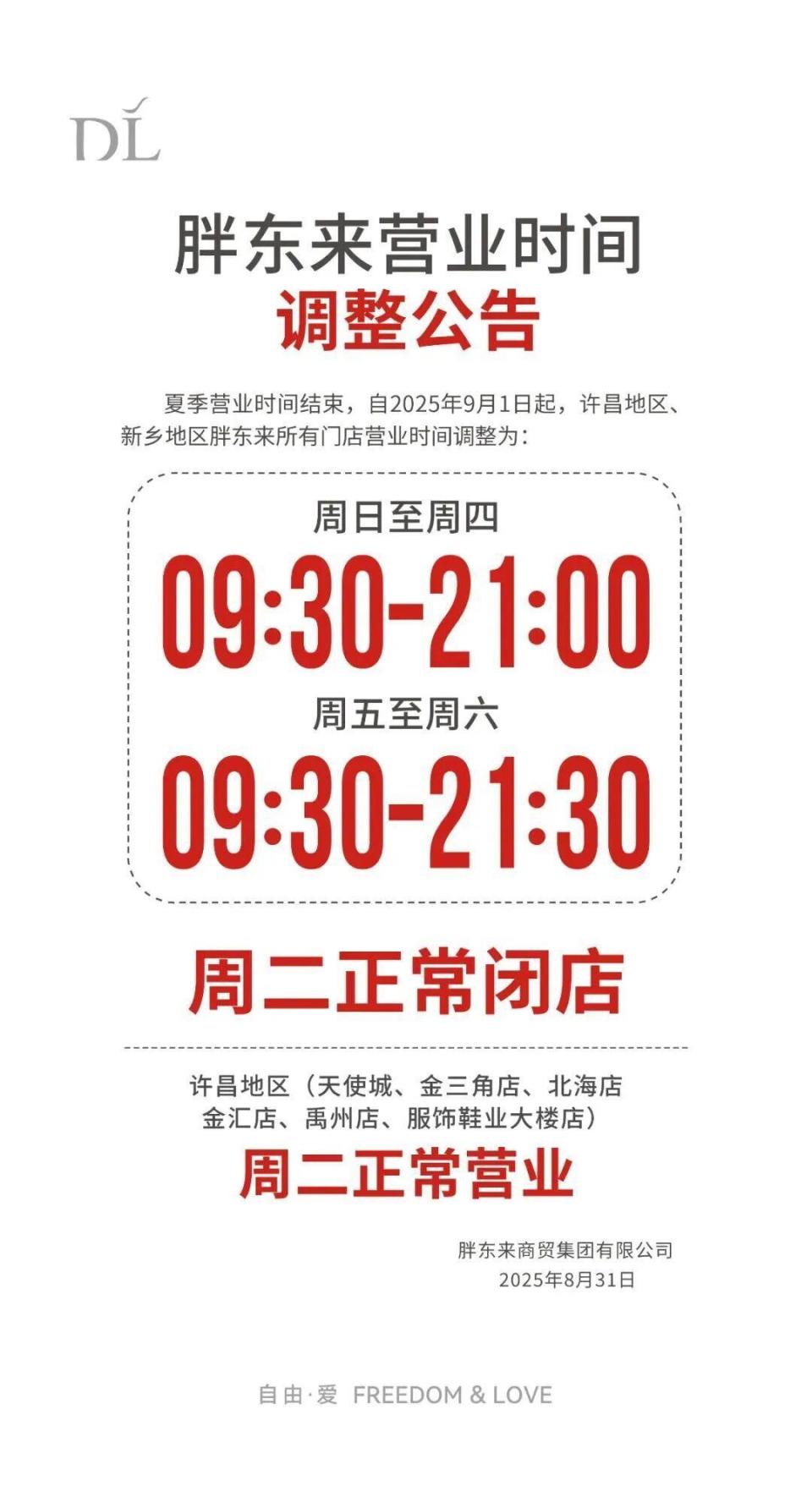 8月31日,胖东来商贸集团有限公司发布一则营业时间调整公告。