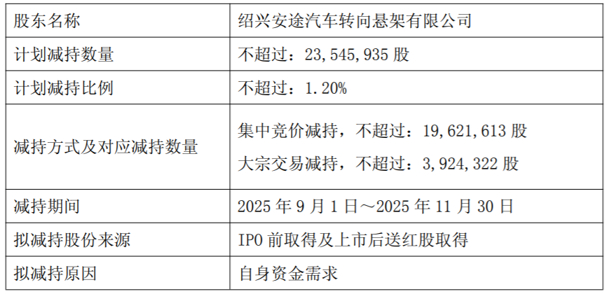 公告显示,瑞丰银行股东绍兴安途汽车转向悬架有限公司(以下简称“安途汽车”)因自身资金需求,计划于今年9月1日至11月30日期间,减持其所持瑞丰银行股份,合计不超过2354.59万股,即不超过该行总股本的1.20%。