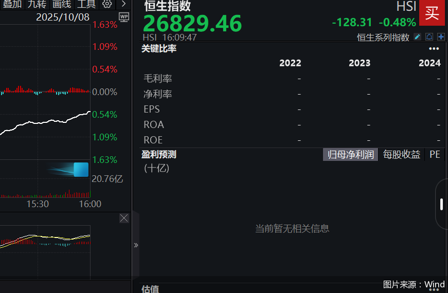 10月8日,港股早盘低开。Wind数据显示,截至收盘,恒生指数下跌0.48%,报26829.46点。同期,恒生科技指数下跌0.55%,报6514.19点。
