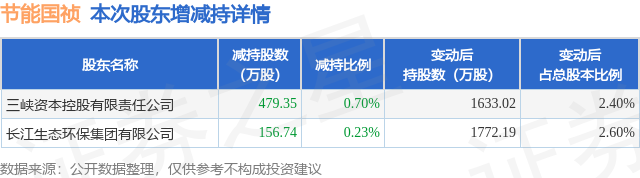 证券之星消息,9月15日节能国祯发布公告《节能国祯:简式权益变动报告书》,其股东三峡资本控股有限责任公司、长江生态环保集团有限公司于2025年9月9日至2025年9月12日间合计减持636.09万股,占公司目前总股本的0.9339%,变动期间该股股价上涨7.51%,截止9月12日收盘报9.31元。