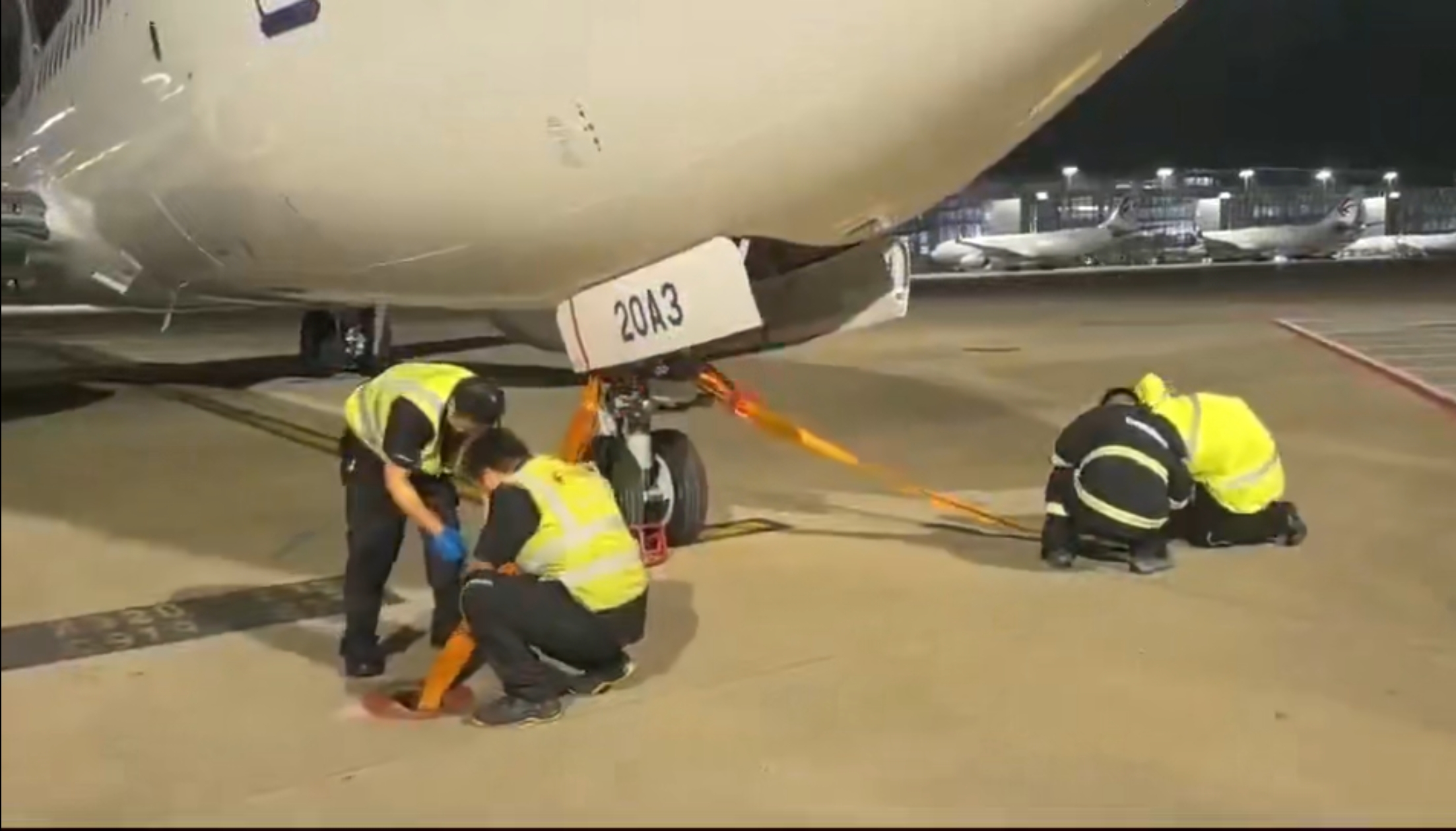 7月29日晚,东航机务正在浦东机场系留航空器。受访者供图