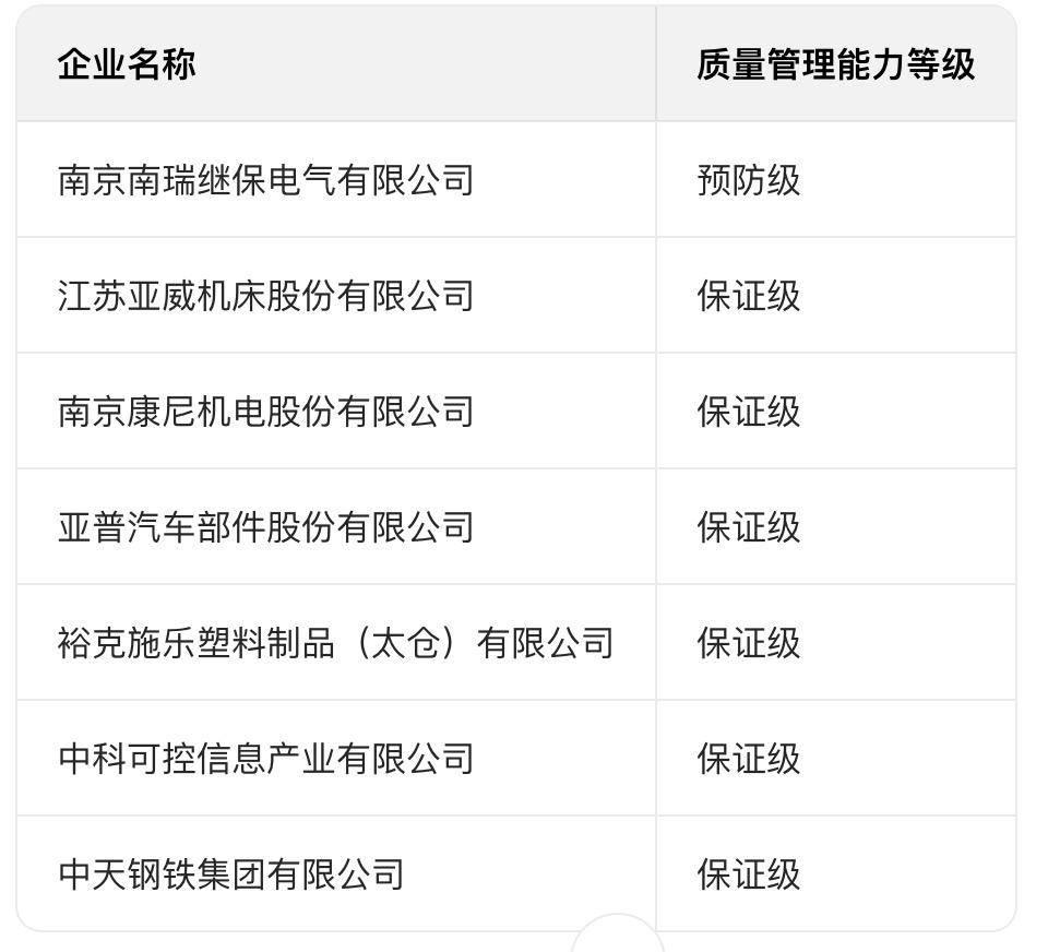 据工信部名单,江苏入选企业包括南京南瑞继保电气有限公司、江苏亚威机床股份有限公司、南京康尼机电股份有限公司、亚普汽车部件股份有限公司、裕克施乐塑料制品(太仓)有限公司、中科可控信息产业有限公司、中天钢铁集团有限公司等。其中,南京南瑞继保电气有限公司是“预防级”,其他均是“保证级”。从质量绩效水平来看,预防级的要求也高于保证级。