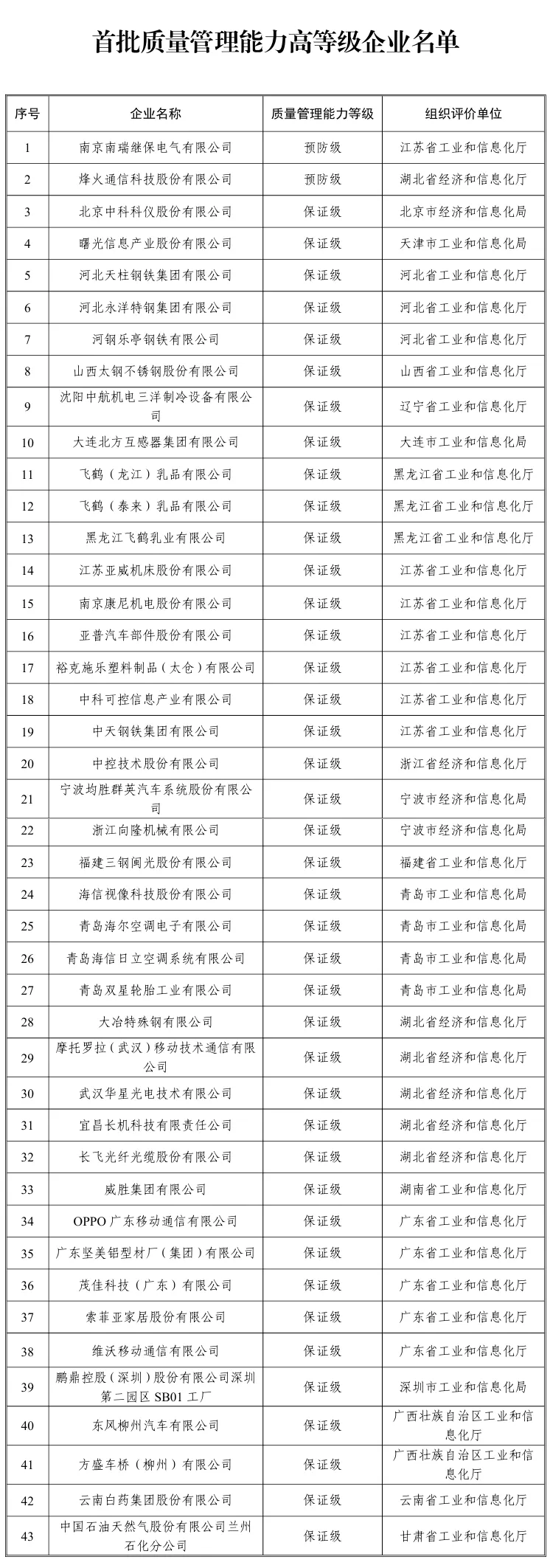 为落实《制造业卓越质量工程实施意见》(工信部联科〔2023〕249号)和《工业和信息化部办公厅关于开展2024年制造业企业质量管理能力评价工作的通知》(工信厅科函〔2024〕160号),经自评价、评价复核、二次复核、征求意见、社会公示,工信部确定了首批43家质量管理能力高等级企业名单,现予以公布。