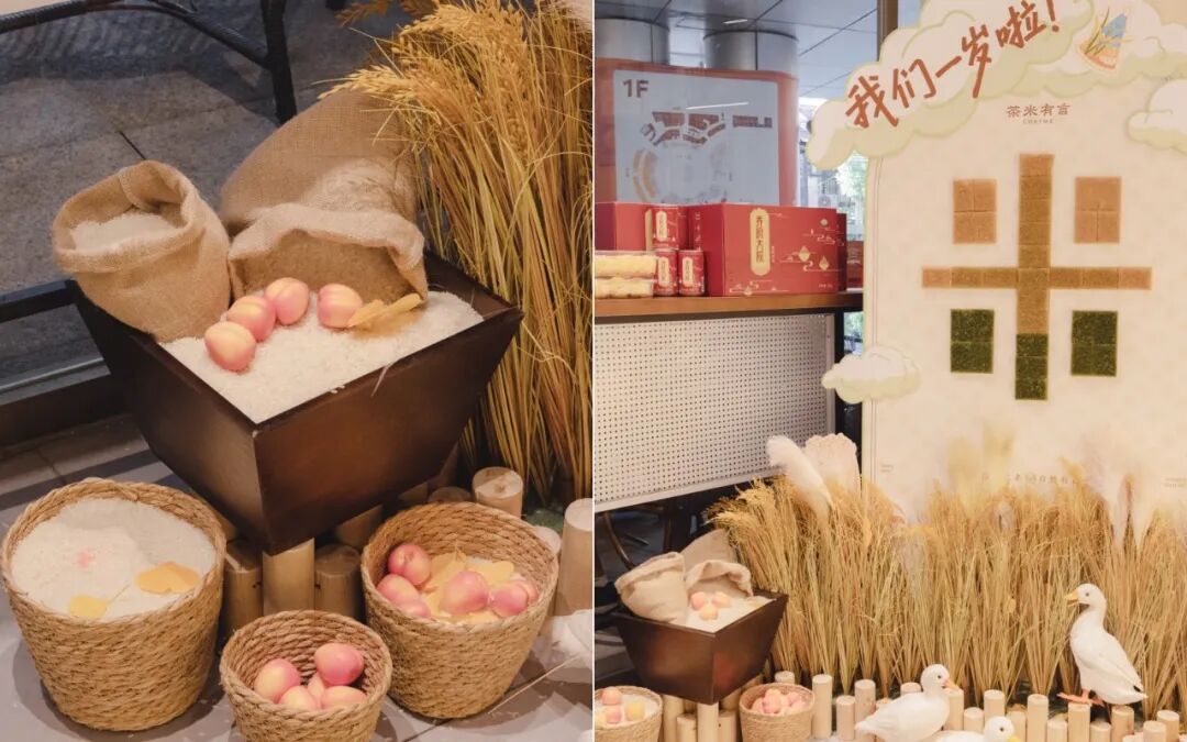 以上海世博广场店为例,墙面壁画描刻了五常大米从“育苗到一杯奶茶”的过程,门店内设置了五常大米展示区,吧台透明呈现成熟的稻子,像一个微型“稻米文化博物馆”。