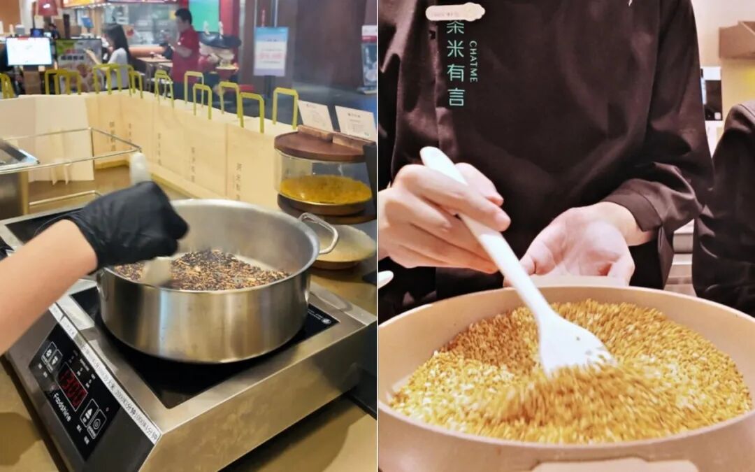 在茶米有言的门店,用户下单鲜米豆花煎米茶后,店员会现场将茶叶、五常大米等小料依次放入锅中煎制,不仅香气四溢,视觉效果也拉满。