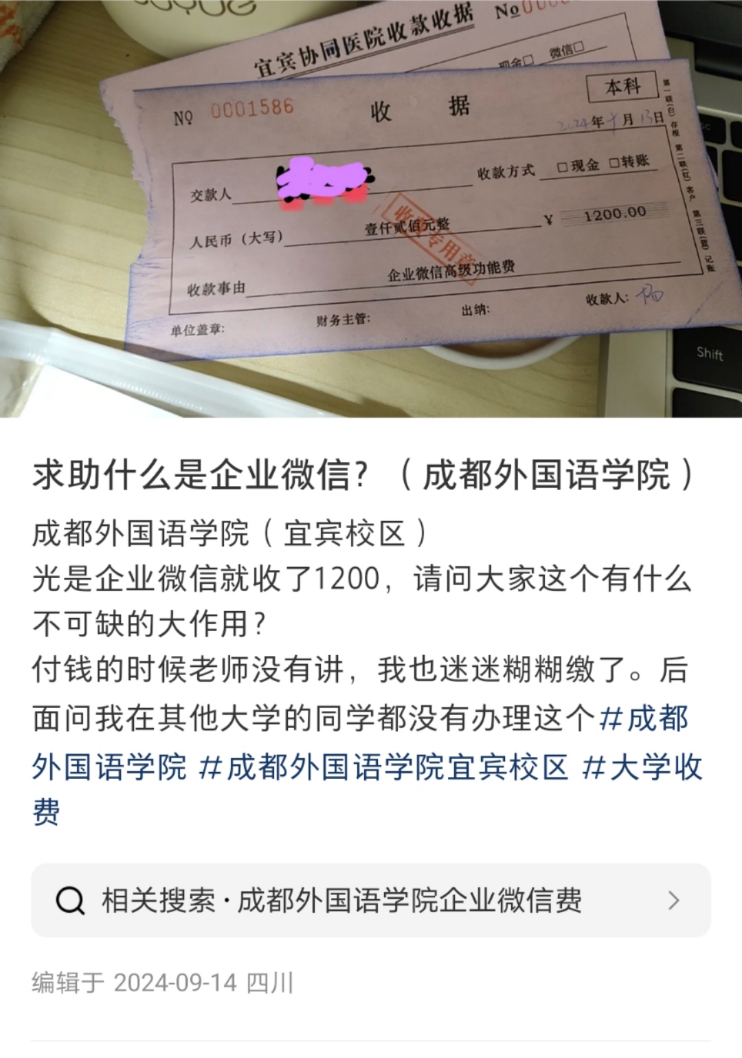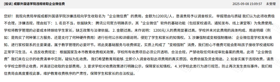 近日,网友反映,成都外国语学院向学生收取“企业微信费”,金额为1200元/人。该软件基本功能是免费的,学校使用它进行教学管理、家校沟通等,应该免费。此收费不合理,希望停止。