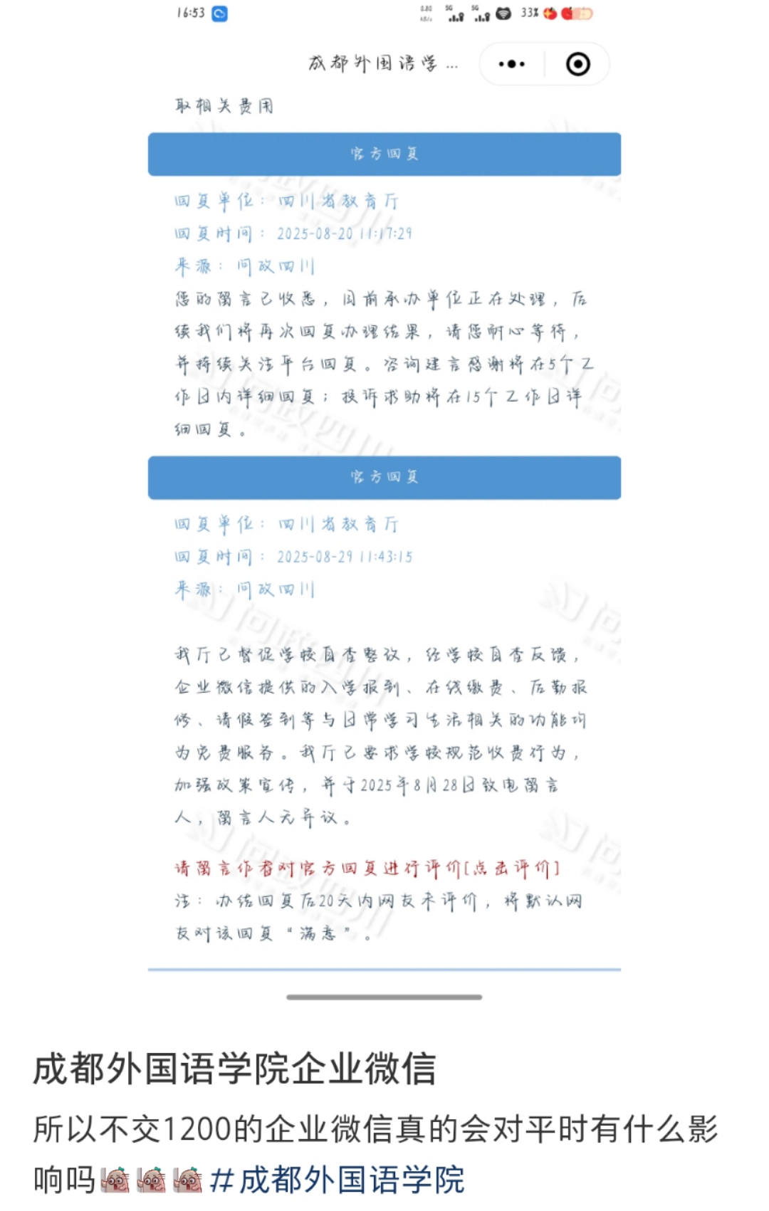 值得注意的是,9月7日,有网友分享其在“问政四川”咨询此事的截图,显示四川省教育厅回复表示,已督促学校自查整改,经学校自查反馈,企业微信提供的入学报到、在线缴费等功能均为免费服务,已要求学校规范收费行为,加强政策宣传。该回复目前在“问政四川”查不到。9月11日,记者致电四川省教育厅,工作人员表示,会将此情况反馈给领导处理。