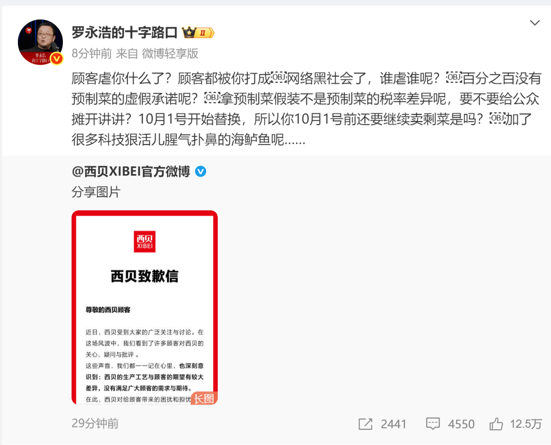随后,知名企业家罗永浩转发了西贝的这封致歉信,并在转发时提出了一系列问题,表达了自己对该事件的看法和疑问。罗永浩的这一举动,进一步将该事件推向了舆论的风口浪尖。