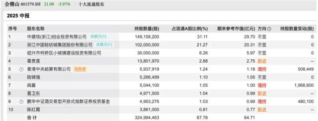 半年报显示,二季度末,葛卫东以个人名义现身会稽山的股东名单,持有497.15万股,期末参考市值为9900万元,为第八大流通股东;同时葛贵莲也成为新晋前十大流通股东,位列第四名,持有1380.20万股,期末参考市值为2.75亿元。两人合计持股市值为3.74亿元。