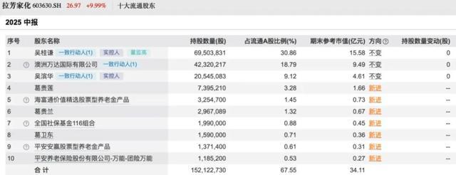 半年报显示,今年二季度末葛卫东以个人名义现身拉芳家化的流通股东名单,但仅买进了159万股,期末参考市值仅3600万元,为第八大流通股东;葛卫东家族的葛贵莲、葛贵兰同样现身该股股东榜,分别买进了739.52万股、296.71万股,期末参考市值分别为1.66亿元、6700万元。二季度末,葛卫东家族三个人合计持有拉芳家化的市值为2.69亿元。