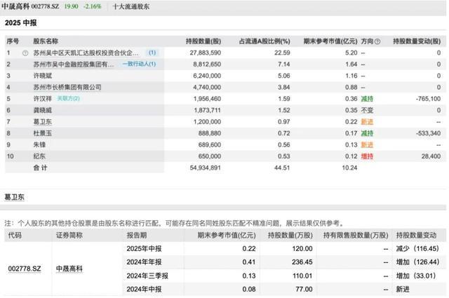 葛卫东今年二季度末再度现身中晟高科的前十大流通股东名单,持有120万股,期末参考市值仅为2200万元。事实上,葛卫东去年二季度末就买进了中晟高科,此后多个季度逐步加仓,但今年一季度末短暂退出了股东名单。