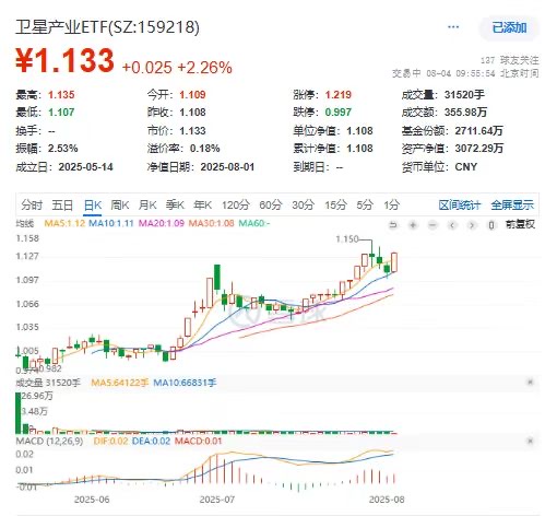 8月4日,军工题材明显活跃。截至9时52分,卫星产业ETF(159218)放量涨2.26%,一度涨2.44%,几大权重股方面,航天电子涨停封板,华测导航涨0.03%,北方导航涨3.67%,中国卫星涨2.89%。