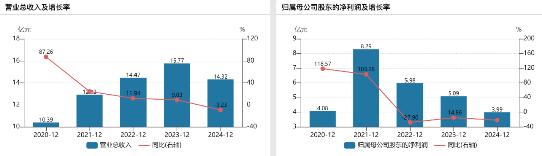 近五年,公司陷入了营收增长乏力、净利润持续下滑的经营困境。2020年至2023年,公司营收虽逐年增长,但增速呈下滑趋势。2024年,公司营收直接出现下滑,同比下降9.23%至14.32亿元。
