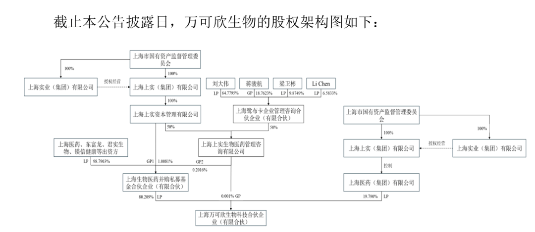从持股结构看,上海生物医药并购私募基金合伙企业(有限合伙)(下称“上海生物医药并购基金”)以80.21%的持股比例成为绝对主导,上海市国资委旗下的上海医药(集团)有限公司持股19.79%,执行运营方上海上实生物医药管理咨询有限公司占0.001%份额。