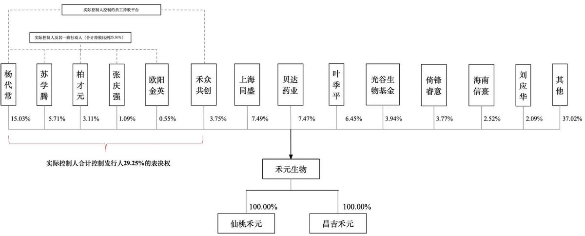 本次上市前,禾元生物的实际控制人为杨代常,其控制表决权比例为29.25%,为该公司董事长兼总经理。此外,贝达药业、杭州贝铭合计持有禾元生物9.02%的股份,海同盛及上海双良合计持股7.63%,叶季平持股6.45%,倚锋睿意及倚锋九期合计持股5.31%。
