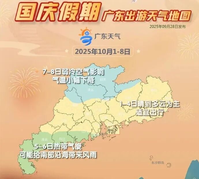 预计,国庆和中秋假期前期(10月1-4日)广东省以晴到多云天气为主;中期(5-6日)热带气旋可能给我省南部市县和海面带来风雨影响;后期(7-8日),有弱冷空气南下影响我省,气温小幅下降,部分市县有阵雨,公众出行需注意适时增减衣物。