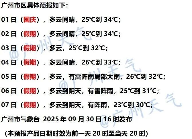广东具体预报如下: 10月1-4日,广东省大部分市县晴到多云,部分市县间中有(雷)阵雨,白天气温较高,大部分市县最高气温33 ℃ ~35℃。 5-6日,粤西市县多云有中雷雨局部大雨,其余大部分市县多云间晴为主,有分散(雷)阵雨。最高气温:中北部市县32 ℃ ~33℃,南部市县29 ℃ ~31℃。 7-8日,我省大部多云,部分市县有 阵雨。最高气温:大部分市县最高气温28 ℃ ~31℃。