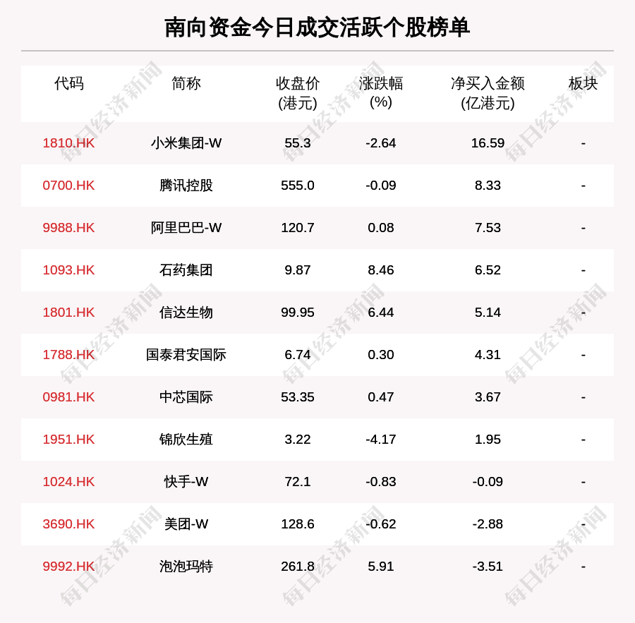 从南向资金的交易活跃个股榜单来看,净买入的个股数量占据优势,共计8只。其中,小米集团-W(股票代码:1810.HK)以55.3港元的收盘价成为净买入金额最多的个股,当日净买入额达到16.592亿港元。这一数据凸显出投资者对小米集团未来发展的看好。