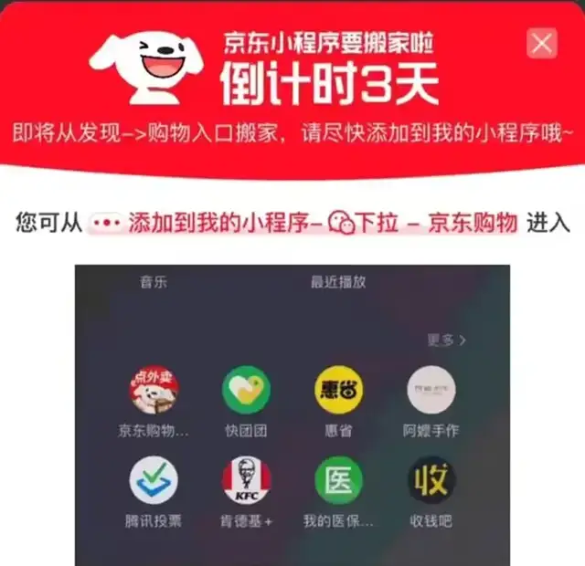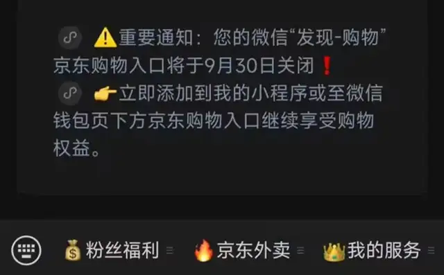 近日,京东购物公众号发布通知,称微信“发现-购物”的京东入口将于9月30日关闭,提醒用户将“京东购物”小程序添加到我的小程序或至微信钱包页下方,以继续享受购物权利。