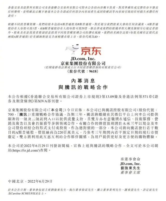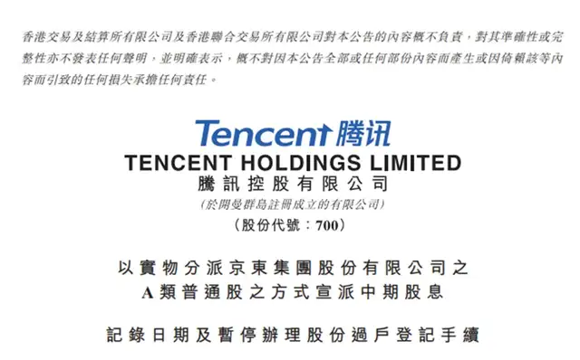 2021年底,腾讯宣布以中期派息方式,将所持有约4.6亿股京东股权发放给股东。本次派息后,腾讯对京东持股比例由17%降至2.3%,意味着腾讯不再是京东的第一大股东。同时,腾讯总裁刘炽平也卸任京东董事。