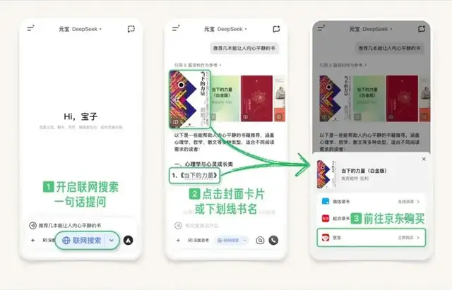 具体来说,用户在和元宝聊天时,如果元宝的回答提到了京东在售的书籍,那么书名将自动显示下划线,且开头会显示封面卡片。用户点击之后,就能直接前往京东购买。