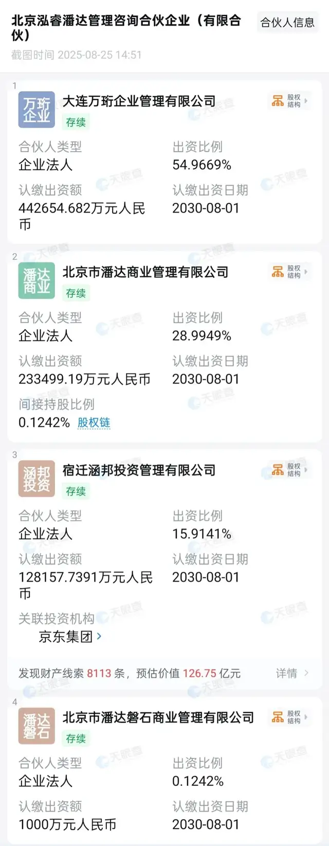 8月,京东又与万达强强联手。天眼查最新披露的工商信息显示,万达与京东旗下公司合作,在北京投资设立北京泓睿潘达管理咨询合伙企业,出资额80.53亿元,经营范围包括企业管理咨询及信息技术咨询等相关业务。