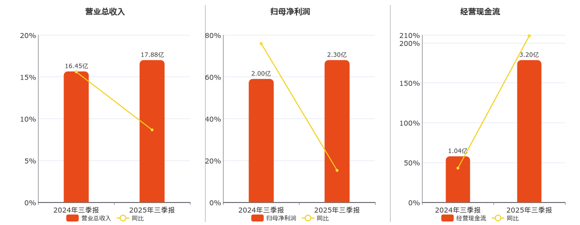 公司营业总收入为17.88亿元。归母净利润为2.30亿元。经营活动现金净流入为3.20亿元。