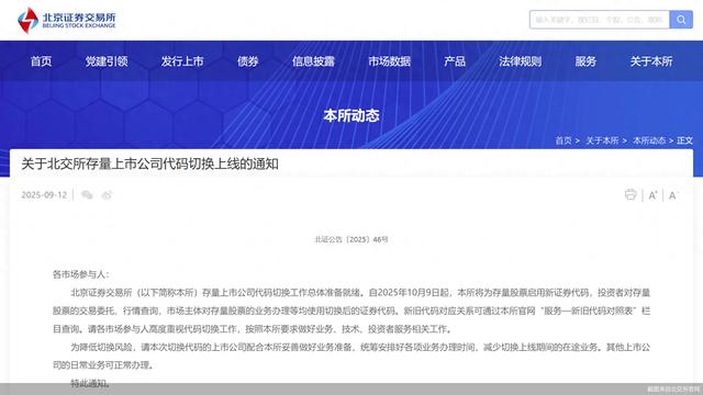 在实施了多次全网测试后,北交所宣布10月9日起将为存量股票启用新证券代码。