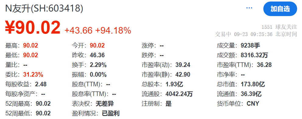 乐居财经 王敏 9月23日,友升股份(SH:603418)在上交所主板挂牌上市,保荐机构为国泰海通,开盘涨94%,总市值173.8亿元。