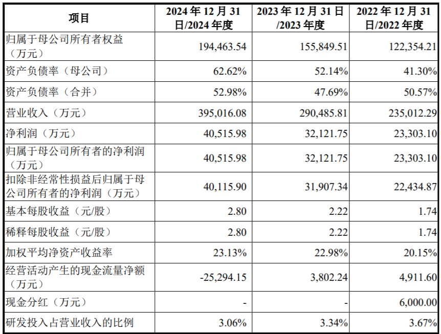 业绩方面,2022年至2024年(报告期内),公司营业收入分别为23.50亿元、29.05亿元和39.50亿元,归属于母公司所有者的净利润分别为2.33亿元、3.21亿元和4.05亿元。