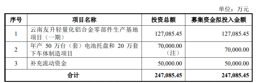 本次IPO,友升股份募集资金拟投入金额24.71亿元,分别用于云南友升轻量化铝合金零部件生产基地项目(一期)、年产50万台(套)电池托盘和20万套下车体制造项目及补充流动资金。