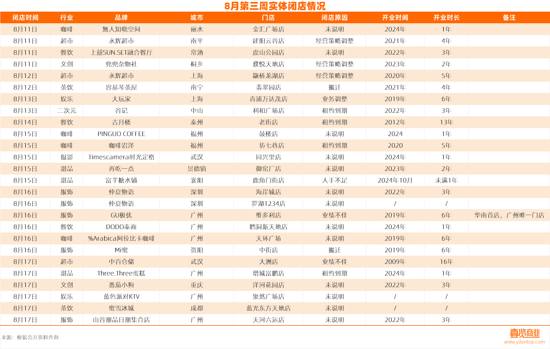 据壹览商业不完全统计,8月第三周,共25个连锁品牌关闭了至少26家门店。