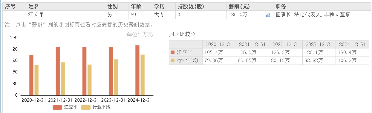 据东方财富网数据,恒立液压董事长汪立平2024年所获薪酬为130.4万元,相较上年薪酬126.1万元微涨。