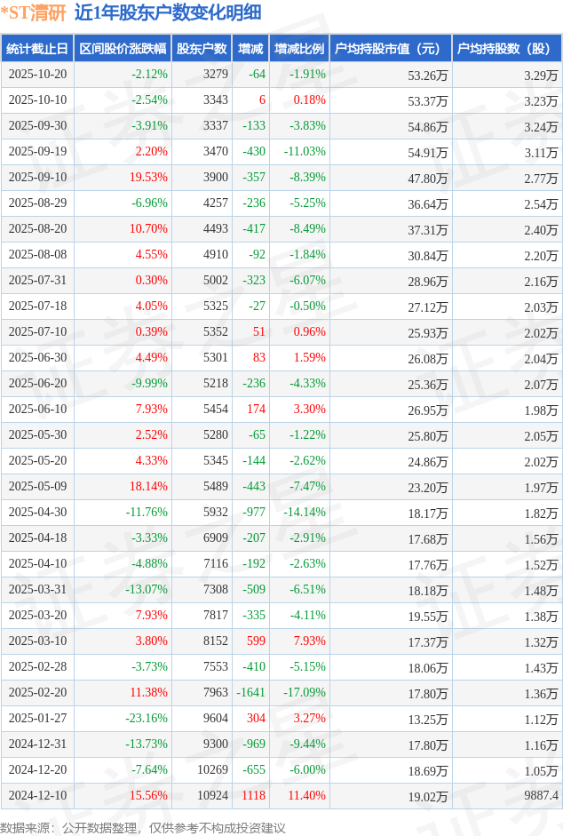 从股价来看,2025年10月10日至2025年10月20日,*ST清研区间跌幅为2.12%,在此期间股东户数减少64.0户,减幅为1.91%。