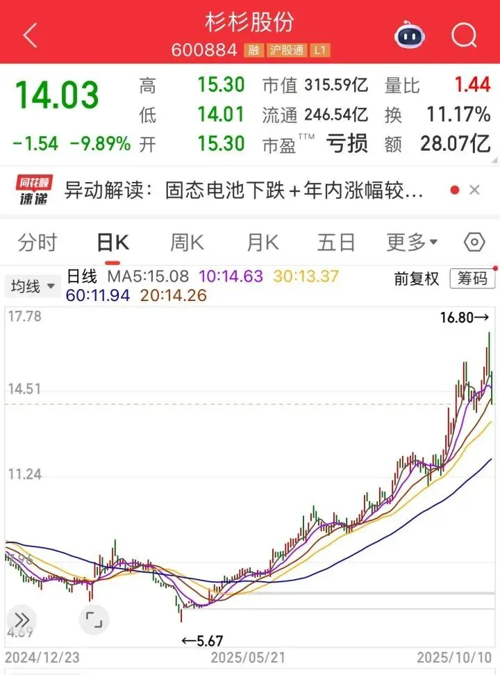 国庆长假后的首个交易日,杉杉股份跌2.08%。今天(10月10日),受固态电池板块整体调整等因素的影响,股价大跌9.89%,收盘报价14.03元/股,当前市值316亿元。
