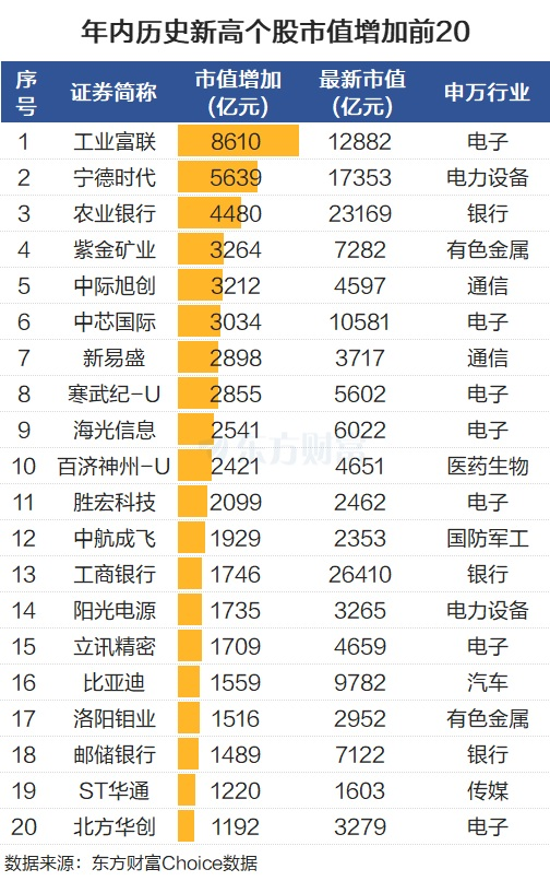 而在这些年内创历史新高个股中,不少公司的市值随着股价大涨也增加明显。比如工业富联,年内市值增加8610亿元,最新为1.29万亿元,排在A股第9位。宁德时代年内增加5639亿元,最新为1.74万亿元,排在A股第6位,且该股市值一度超过贵州茅台。农业银行、紫金矿业、中际旭创等个股市值增加也居前。整体而言,年内创历史新高个股中,有20股市值增加超千亿。