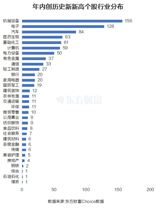 从行业分布来看,年内创历史新高的877股,分布于机械设备最多,达156家。电子紧随其后,为128家。汽车、医药生物、基础化工、计算机、电力设备等也分布靠前。而这些目前行业也确实反映了一些大热题材,比如人形机器人、AI算力、创新药、原材料涨价等。