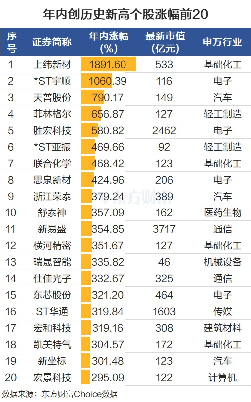 再看涨幅的话,在这些创历史新高个股中,人形机器人概念股、年内13次历史新高的上纬新材成为年内A股的涨幅王,截至9月26日收盘累计上涨1891.6%。资料显示,因具身智能领域的明星企业智元机器人计划收购并取得其控制权,从而使得上纬新材成为资本追逐的对象。