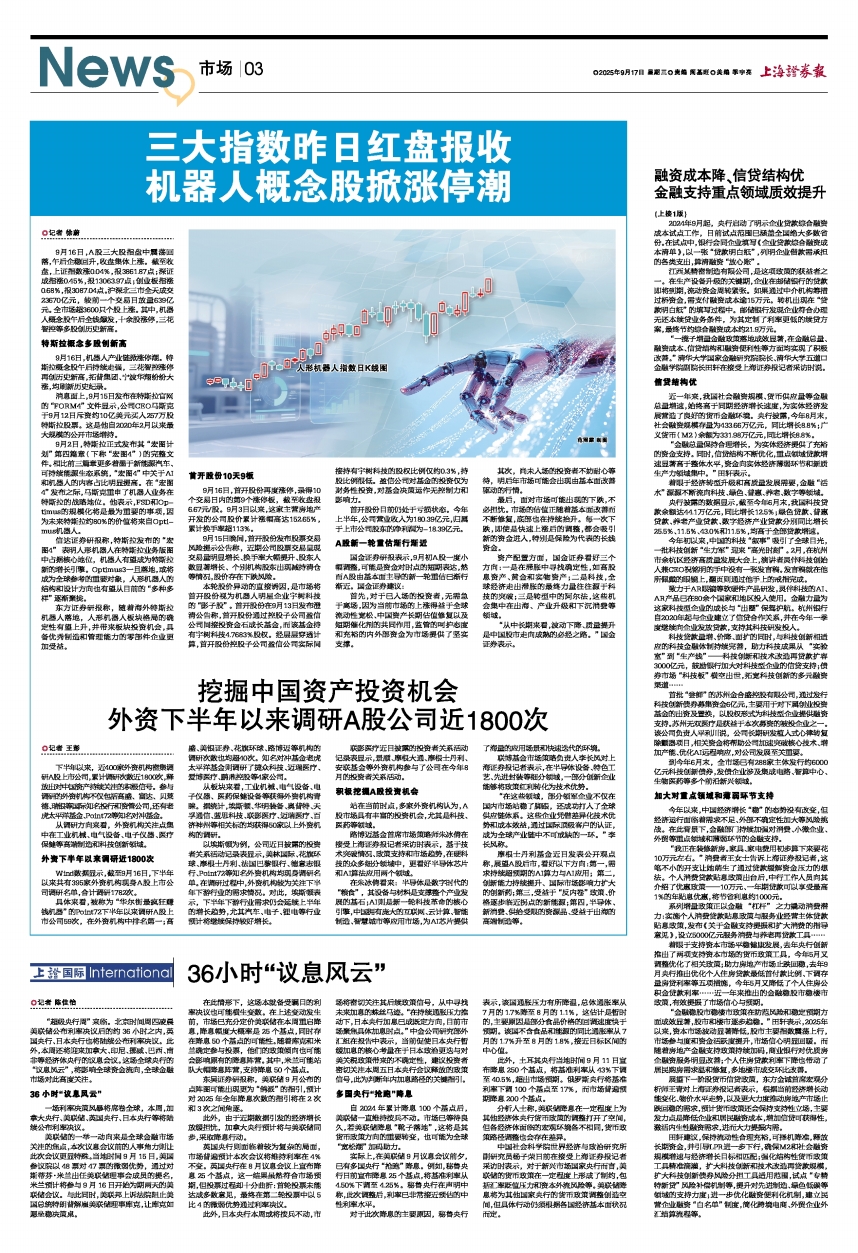 9月16日,A股三大股指盘中震荡回落,午后企稳回升,收盘集体上涨。截至收盘,上证指数涨0.04%,报3861.87点;深证成指涨0.45%,报13063.97点;创业板指涨0.68%,报3087.04点。沪深北三市全天成交23670亿元,较前一个交易日放量639亿元。全市场超3600只个股上涨。其中,机器人概念股午后全线爆发,十余股涨停,三花智控等多股创历史新高。