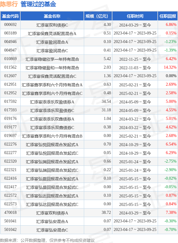 陈思行女士:中国国籍,复旦大学金融学硕士。2011年7月至2012年9月任方正证券投资经理;2012年10月至2016年7月任光大证券高级投资经理;2016年9月至2019年4月任银华基金投资经理;2019年5月至2021年12月任平安养老投资经理;2021年12月至2022年7月任国寿养老高级投资经理。2022年7月加入汇添富基金。2022年8月23日至2024年3月29日任汇添富双利债券型证券投资基金的基金经理助理。2022年8月23日至2024年6月13日任汇添富鑫福债券型证券投资基金的基金经理助理。2023年2月1日至2024年5月9日任汇添富添添乐双盈债券型证券投资基金的基金经理助理。2023年8月29日至今任汇添富绝对收益策略定期开放混合型发起式证券投资基金的基金经理助理。2023年11月24日至今任汇添富稳荣回报债券型发起式证券投资基金的基金经理助理。2024年4月9日至今任汇添富稳兴回报债券型发起式证券投资基金的基金经理助理。2022年11月3日至今任汇添富稳健盈和一年持有期混合型证券投资基金的基金经理。2024年3月22日至今任汇添富添添乐双鑫债券型证券投资基金的基金经理。2024年3月29日至今任汇添富双利债券型证券投资基金的基金经理。2024年5月9日至今任汇添富添添乐双盈债券型证券投资基金的基金经理。2024年10月29日至今任汇添富弘悦回报混合型发起式证券投资基金的基金经理。2025年01月24日至今任汇添富弘瑞回报混合发起式的基金经理。2025年2月21日担任汇添富鑫享添利六个月持有期混合型证券投资基金基金经理。2025年05月15日至今任汇添富弘达回报混合发起式的基金经理。2025年05月15日至今任汇添富弘盛回报混合发起式的基金经理。2025年06月13日担任汇添富双颐债券型证券投资基金基金经理。曾任汇添富稳健欣享一年持有期混合型证券投资基金基金经理。