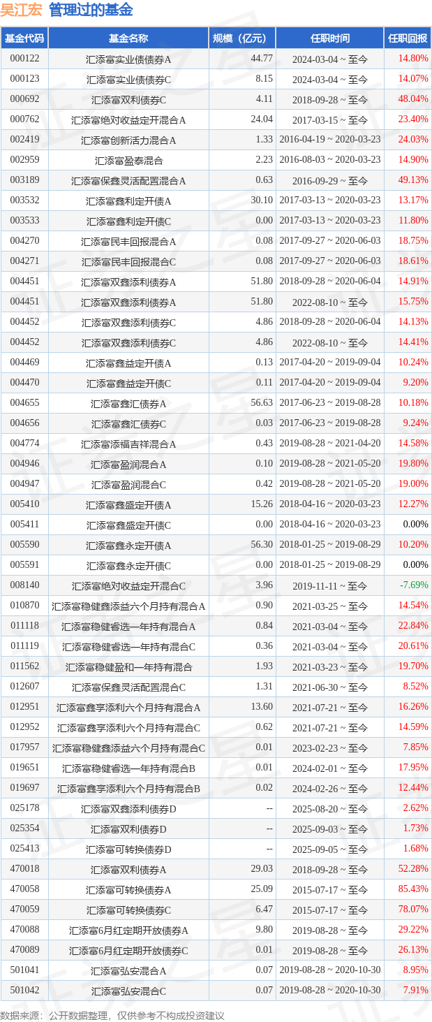 吴江宏先生:中国,厦门大学经济学硕士。2011年加入汇添富基金管理股份有限公司,历任固定收益分析师,现任稳健收益部总经理。2015年07月17日至今任汇添富可转换债券的基金经理。2016年04月19日至2020年03月23日任汇添富盈安灵活配置混合的基金经理。2016年08月03日至2020年03月23日任汇添富盈泰混合的基金经理。2016年09月29日至今任汇添富保鑫灵活配置混合的基金经理。2017年03月13日至2020年03月23日任汇添富鑫利定开债的基金经理。2017年03月15日至今任汇添富绝对收益定开混合的基金经理。2017年04月20日至2019年09月04日任汇添富鑫益定开债的基金经理。2017年06月23日至2019年08月28日任添富鑫汇定开债券的基金经理。2017年09月27日至2020年06月03日任汇添富民丰回报混合的基金经理。2018年01月25日至2019年08月29日任添富鑫永定开债的基金经理。2018年04月16日至2020年03月23日任添富鑫盛定开债的基金经理。2018年09月28日至2020年06月04日任添富年年丰定开混合的基金经理。2018年09月28日至今任汇添富双利债券的基金经理。2019年08月28日至2021年04月20日任添富添福吉祥混合的基金经理。2019年08月28日至今任汇添富6月红定期开放债券的基金经理。2019年08月28日至2020年10月30日任汇添富弘安混合的基金经理。2019年08月28日至2021年05月20日任添富盈润混合的基金经理。2021年03月04日至今任汇添富稳健睿选一年持有混合的基金经理。2021年03月23日至今任汇添富稳健盈和一年持有混合的基金经理。2021年03月25日至今任汇添富稳健鑫添益六个月持有混合的基金经理。2021年07月21日至今任汇添富鑫享添利六个月持有混合的基金经理。2022年8月10日担任汇添富双鑫添利债券型证券投资基金基金经理。2024年03月04日担任汇添富实业债债券型证券投资基金基金经理。