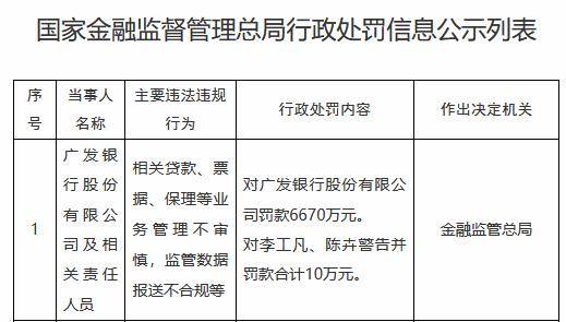 9月12日,国家金融监督管理总局披露,广发银行因相关贷款、票据、保理等业务管理不审慎,监管数据报送不合规等违法违规行为,被罚款6670万元,相关责任人员被处警告并罚款合计10万元。