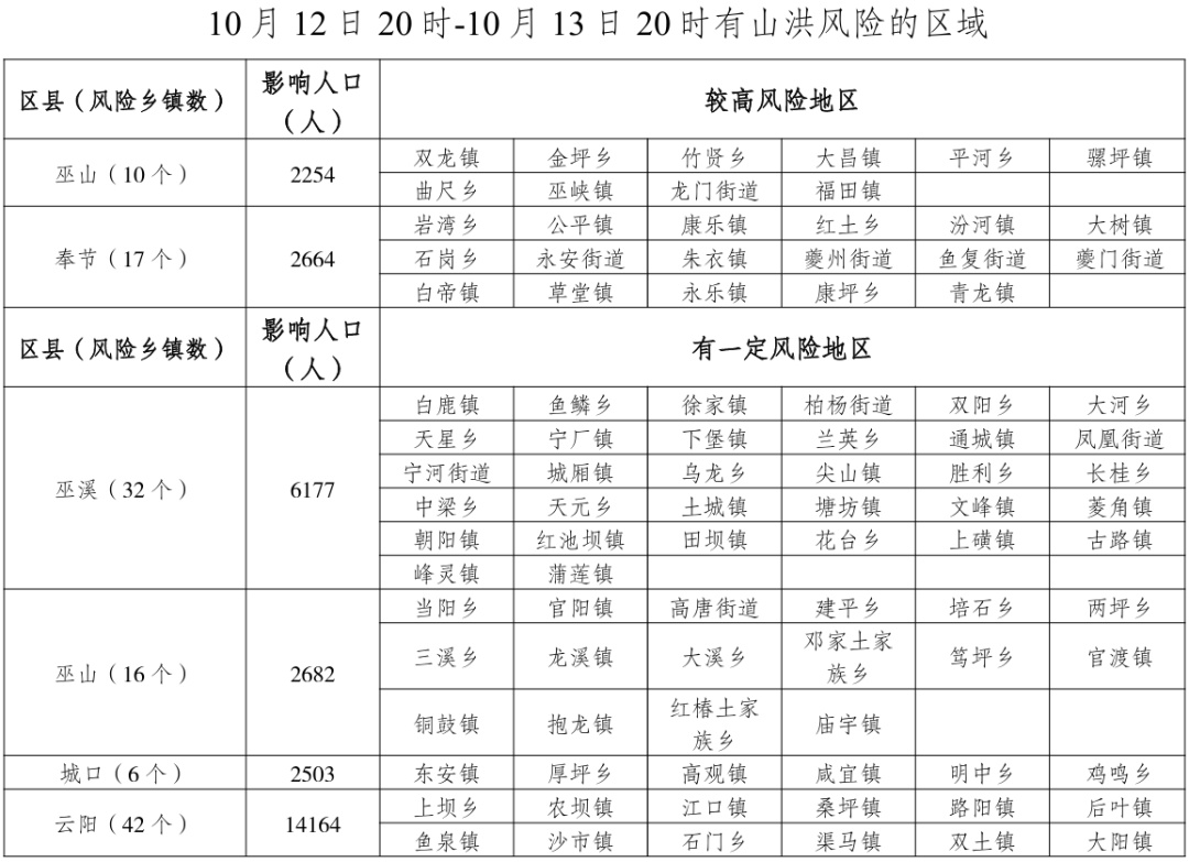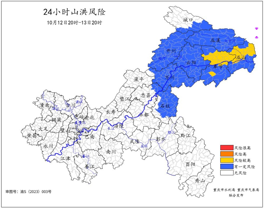 重庆市水利局和重庆市气象局10月12日16时联合发布 小流域山洪灾害气象风险预警: