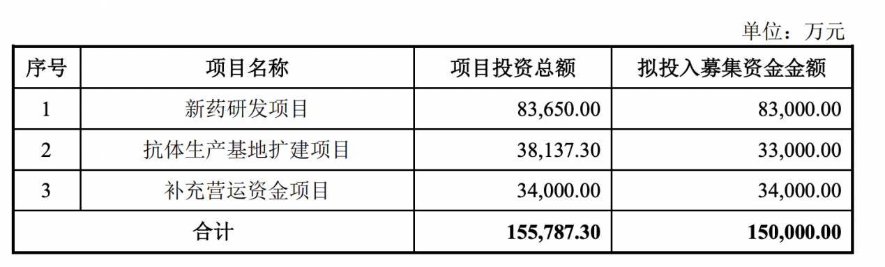 本次IPO,泰诺麦博拟募集资金15亿元,将用于新药研发项目、抗体生产基地扩建项目、补充营运资金项目。