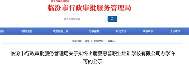 蒲县惠普职业培训学校有限公司向临汾市行政审批服务管理局申请注销《民办学校办学许可证》(编号:人社民314100040000759号),根据《中华人民共和国民办教育促进法》第八章第五十六条的规定,现依法予以公示,公示时间从2025年9月11日至2025年9月19日。如有异议,请于公示期间以书面方式向临汾市行政审批服务管理局反映。