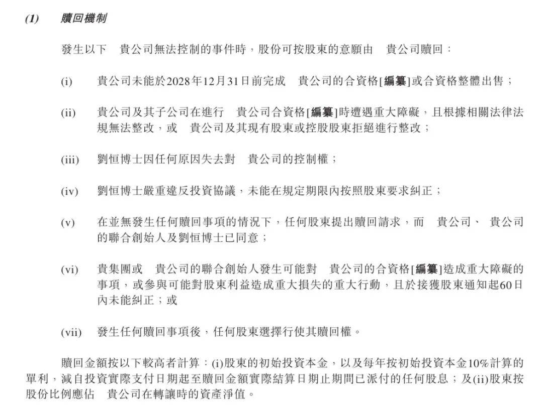 但投资方与企业也签署了对赌协议,若公司在2028年12月31日前未完成上市或合格整体出售等条款,股东可要求公司赎回股份。