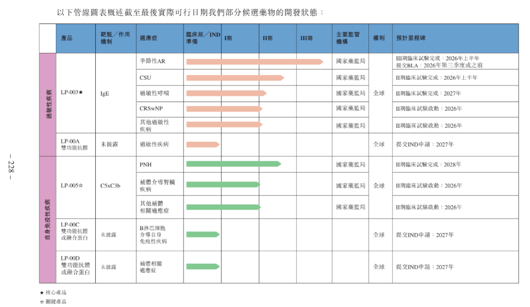 但资本热度难掩现实压力,公司至今未盈利,核心产品均未商业化,进展最快的核心产品下一代抗IgE抗体(免疫球蛋白E,一种参与过敏反应的抗体)LP-003用于季节性过敏适应症,要到2026年三季度才计划提交上市申请。这意味着,公司在此之前仍需靠融资推进研发。