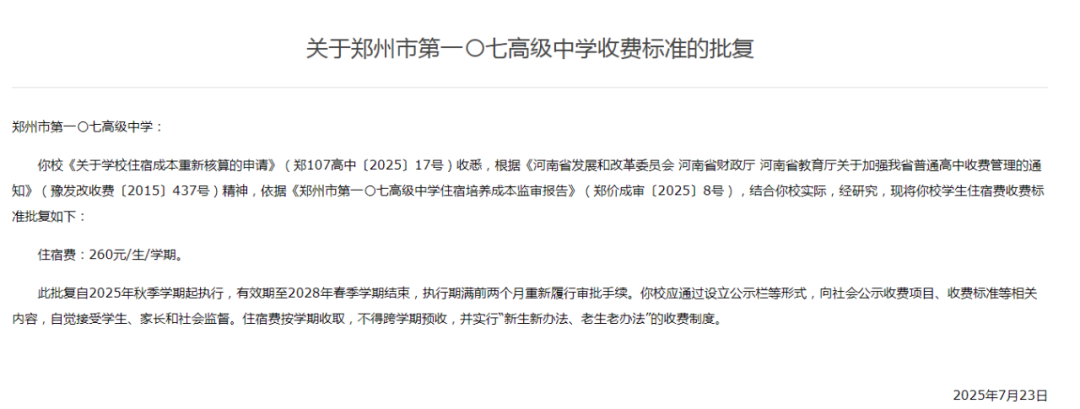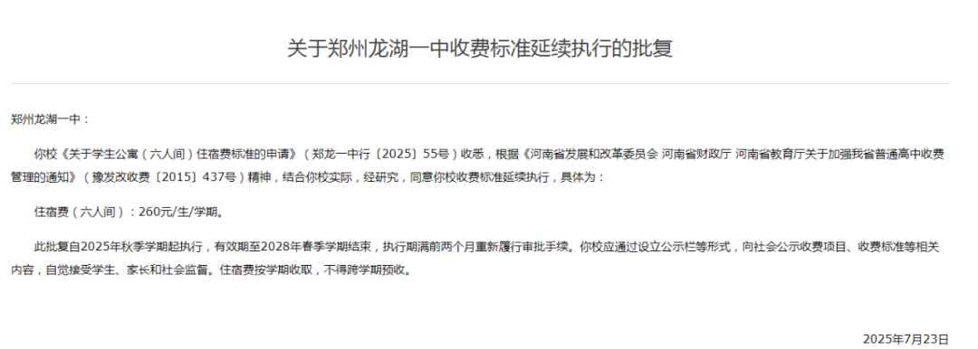 住宿费:260元/生/学期。此批复自2025年秋季学期起执行,有效期至2028年春季学期结束,执行期满前两个月重新履行审批手续。学校应通过设立公示栏等形式,向社会公示收费项目、收费标准等相关内容,自觉接受学生、家长和社会监督。住宿费按学期收取,不得跨学期预收,并实行“新生新办法、老生老办法”的收费制度。