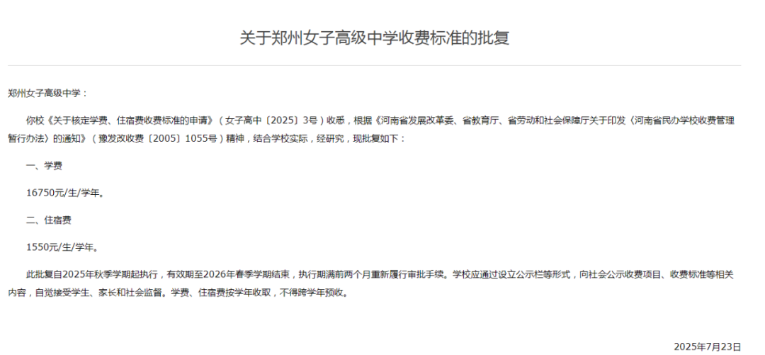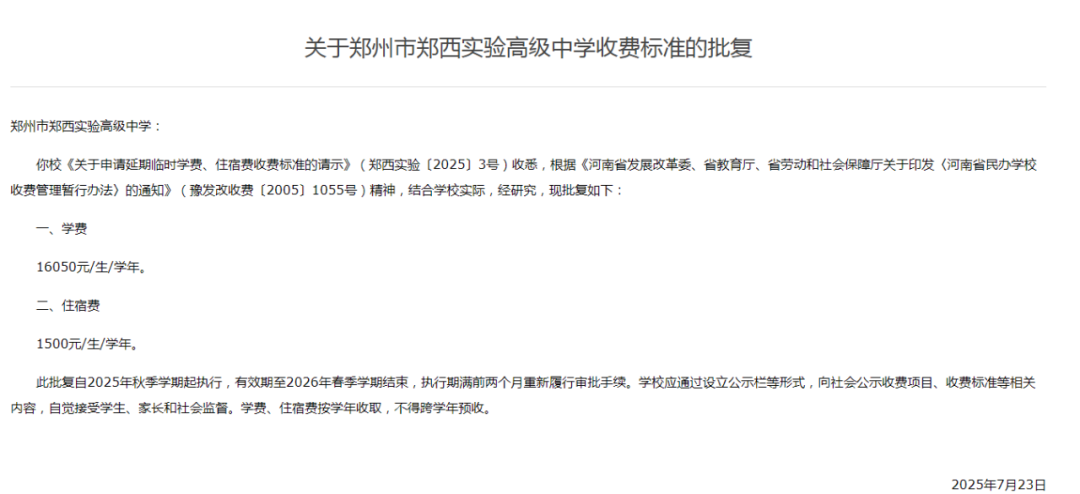 04郑州市郑西实验高级中学一、学费16050元/生/学年。二、住宿费1500元/生/学年。此批复自2025年秋季学期起执行,有效期至2026年春季学期结束,执行期满前两个月重新履行审批手续。学校应通过设立公示栏等形式,向社会公示收费项目、收费标准等相关内容,自觉接受学生、家长和社会监督。学费、住宿费按学年收取,不得跨学年预收。